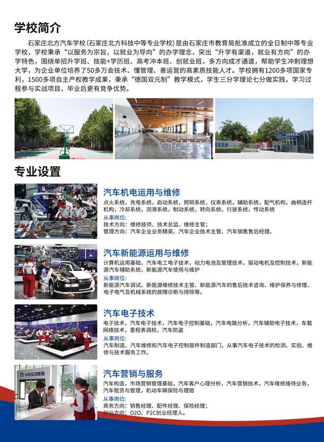 石家庄北方科技中等专业学校是一所专门培养高素质技能人才的职业院校,自创办以来始终秉承着“严谨办学,教书育人,技术为本”的办学理念,经过近30年的研发与积累,开设有汽车、互联网、烹饪三大人才培养方向,包含新能源汽车、汽车高级工程师、汽车美容装潢、新媒体运营与直播、影视动漫设计、视觉传达、御宴总厨、中餐大厨、金典西餐西点等诸多热门专业