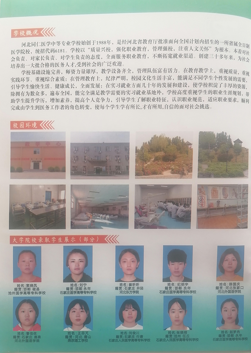 河北同仁医学中等专业学校始创于1988年,是经河北省教育厅批准而向全国计划内招生的一所省属全日医学院校,统招代码6181学校以“质量兴校,强化职业教育,管理强校,注重人文关怀”为根本。本着对社会负责、对家长负责、对学生负责的态度,全面服务职业教育,不断拓宽就业渠道。创建三十多年来,为培养出一大批合格的医务人才,受到社会的广泛欢迎